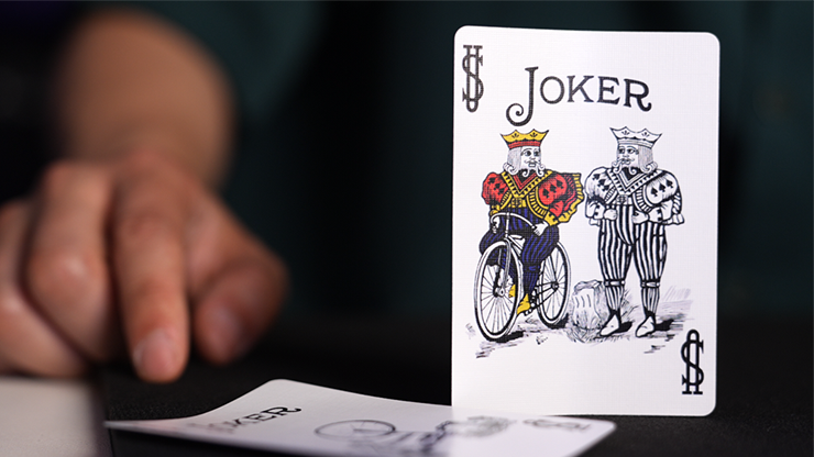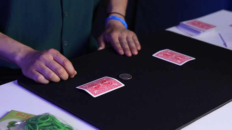 The magician shows two playing cards (Big Joker & Little Joker) and a coin, demonstrating how the coin vanishes and travels between the cards. When the spectator tries it themselves, the "magic" suddenly stops working. Just as everyone wonders what went wrong, the cards are turned over: the Little Joker has disappeared, leaving only a bicycle on his card... while on the Big Joker's card, the Little Joker is now clinging tightly to the Big Joker, exchanging an awkward glance.