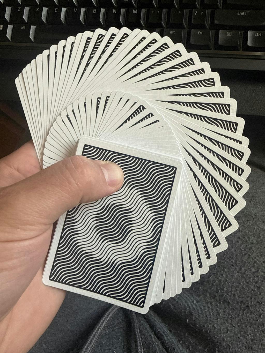 The Waves design features a subtle one-way design. This creates a low-key flipbook animation effect when the cards are shuffled in reverse directions and riffled. Magicians can also take advantage of the one-way design to secretly locate and track cards of interest.