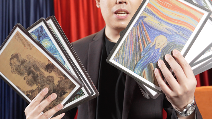On stage, a picture frame is hidden beneath a velvet shroud as the magician calls up a volunteer. He presents a box of mixed puzzles pieces and invites the spectator to select one. He also presents a selection of cards, each with a different famous painting on it, and the volunteer chooses one as well.